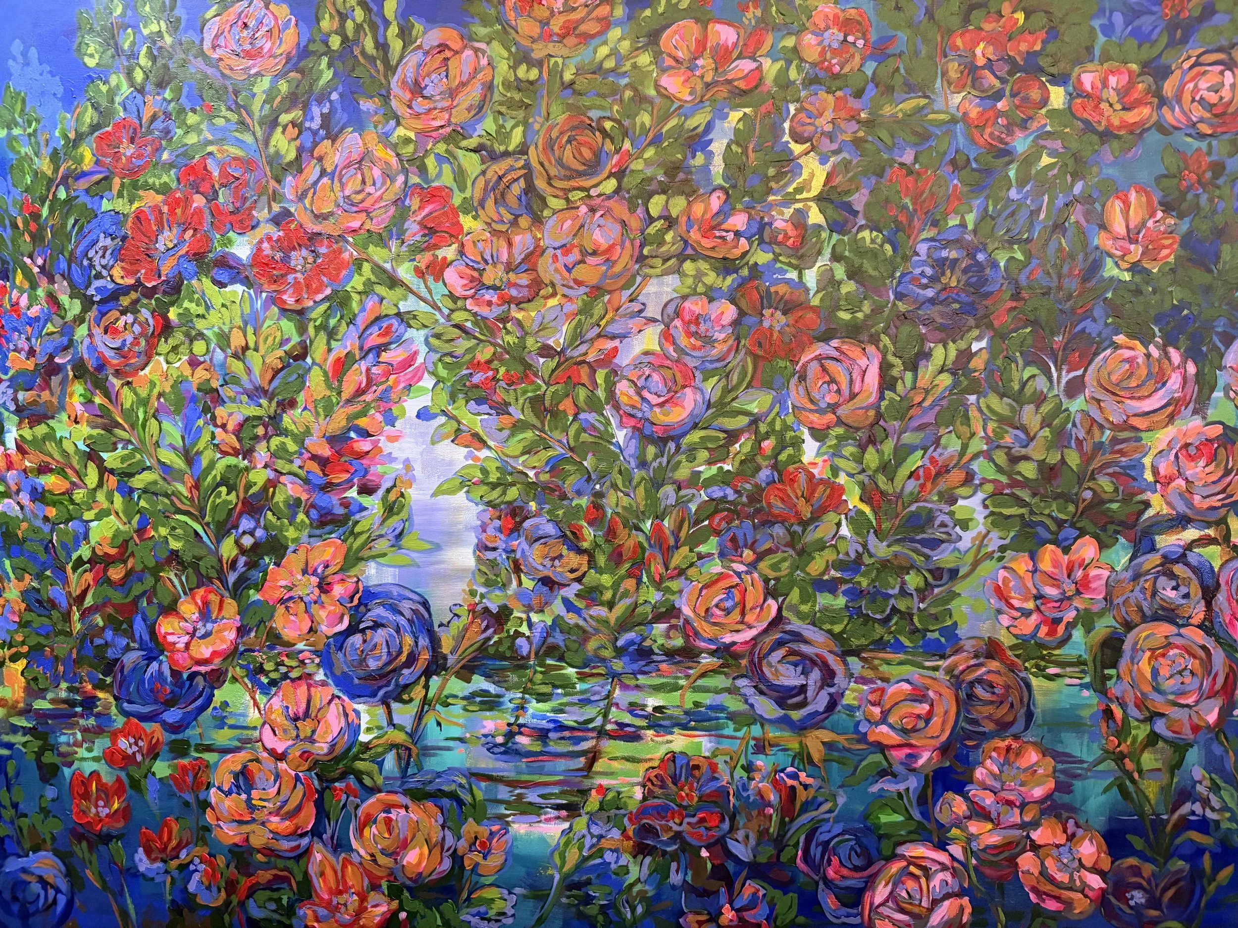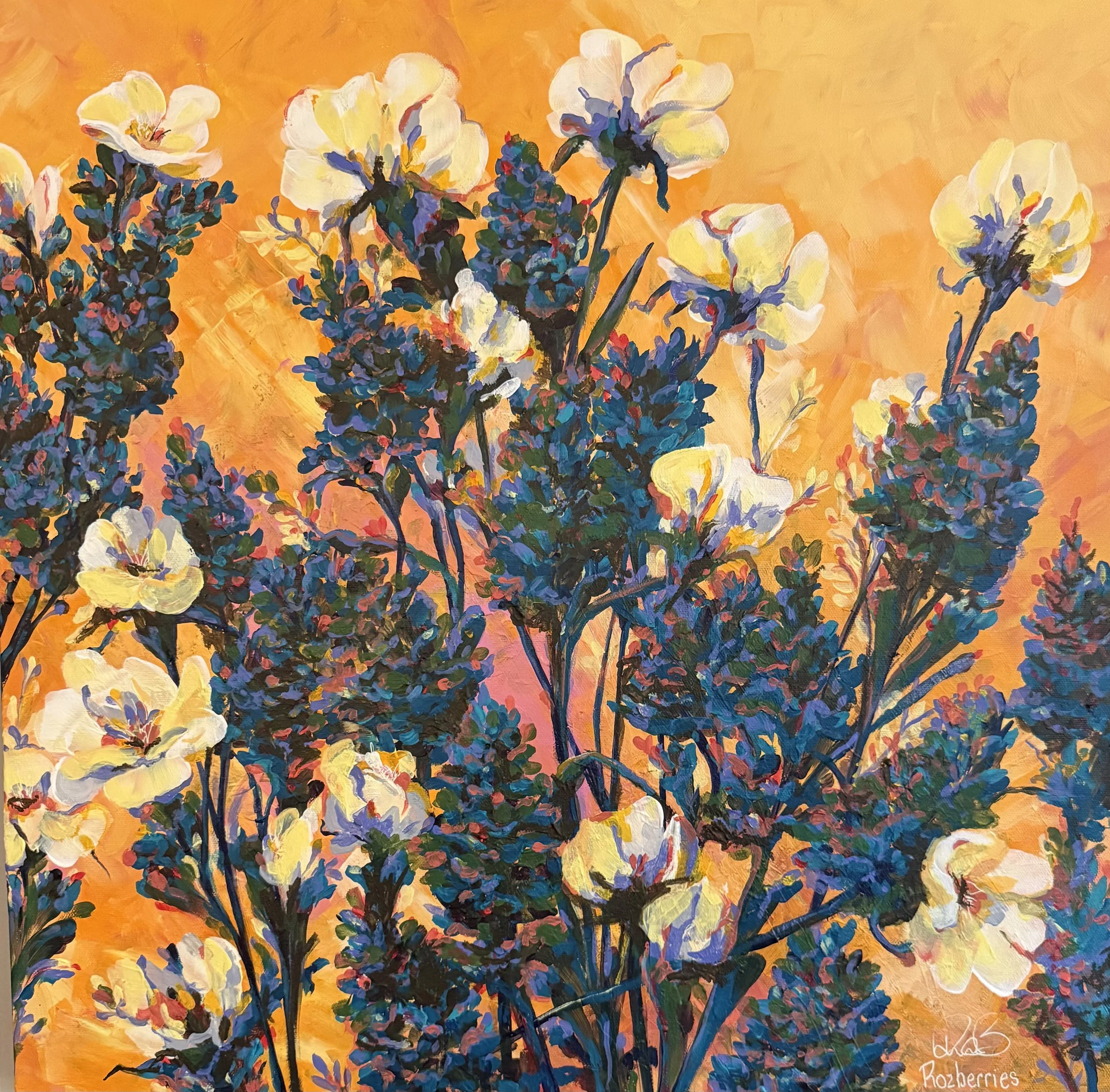 24” x 24”, Acrylic on Canvas. This painting study was an exploration of golden light. Roz seldom uses photo references; instead, she studies scenes privately as a form of meditation. She then brings to the canvas what her mind can recall, allowing memory and imagination to guide her work. Occasionally, flowers emerge in the painting that cannot be found in the natural world, reflecting a creative freedom that transcends literal representation. This approach results in compositions that blend reality with an ethereal quality, inviting viewers to experience light and color through a uniquely personal lens.