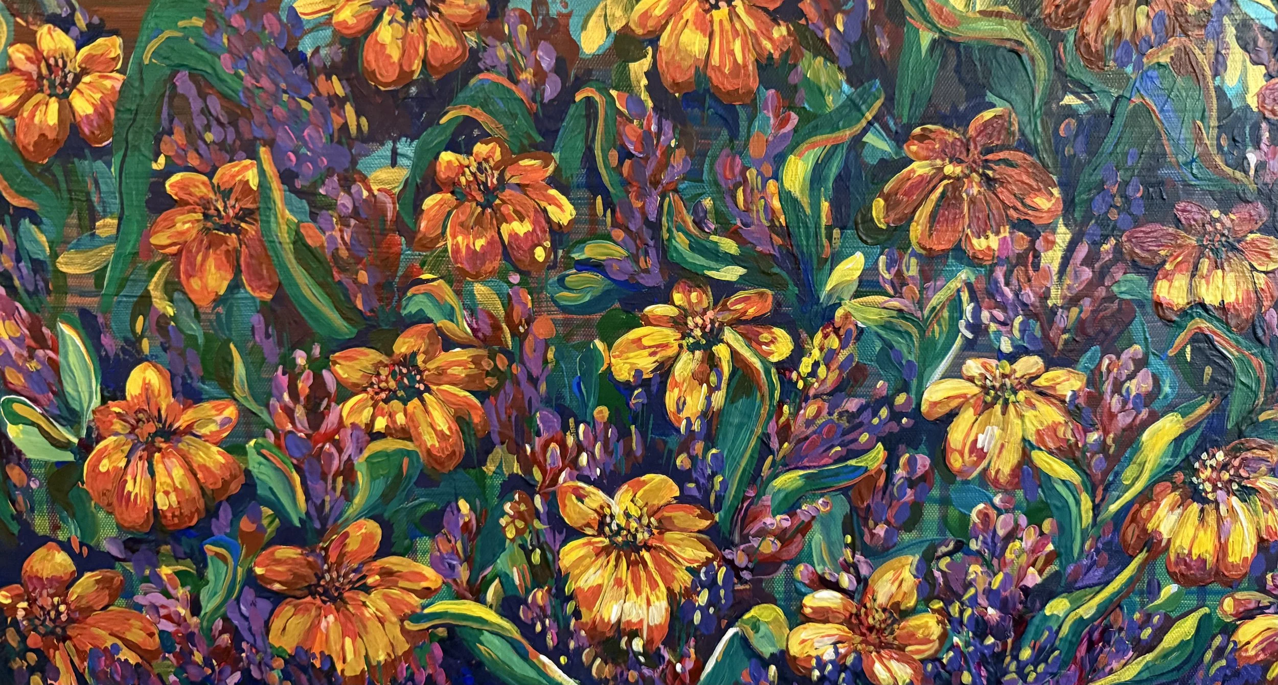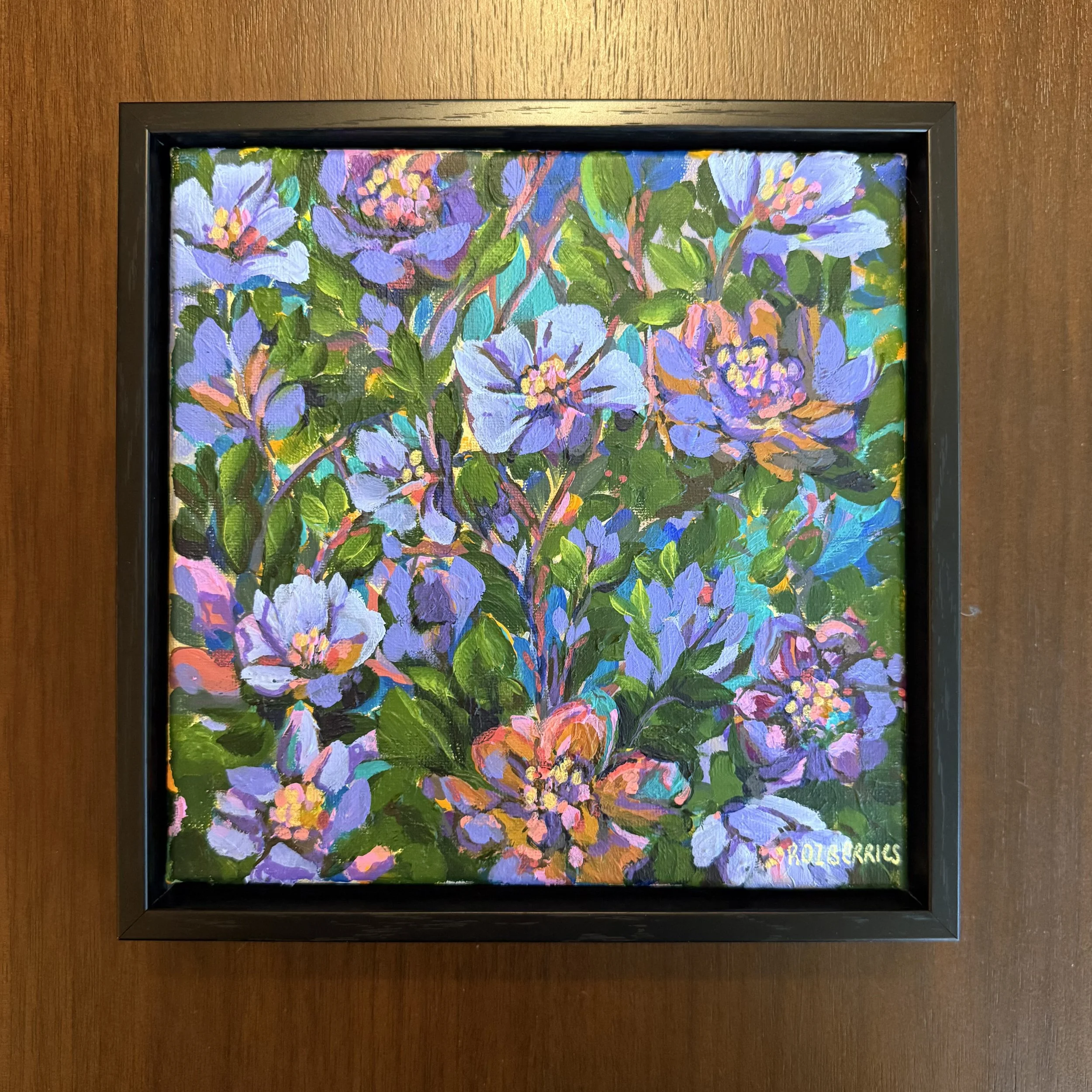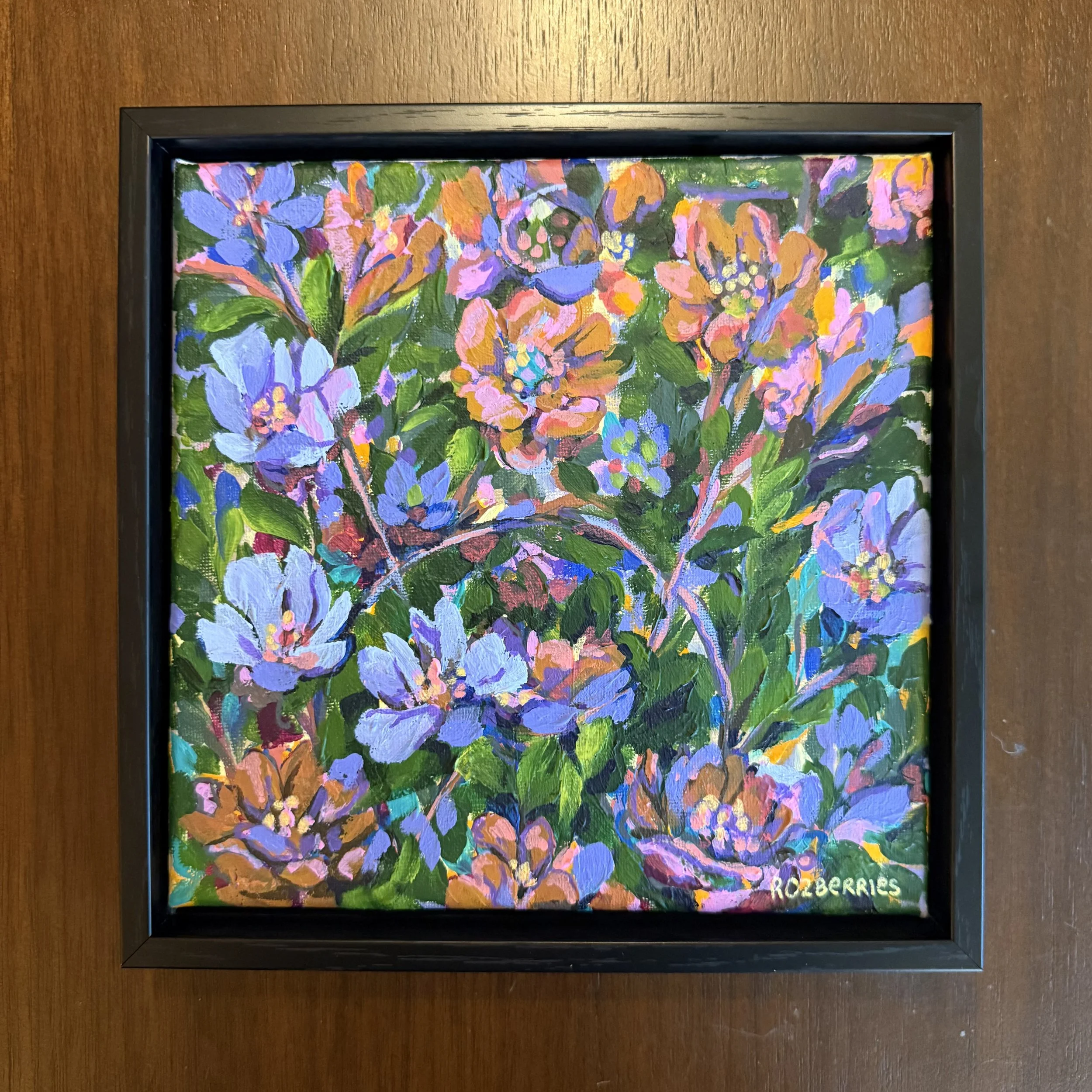 28” x 14” gouache, acrylic on canvas. This painting is a study of contrast and material, highlighting Roz's unique approach to floral art. Each flower is treated as an individual entity, existing in its own universe rather than as part of a collective bouquet. The focus is not on capturing a generic floral image but on exploring the distinct qualities and nuances that make each flower unique. The way the sunlight interacts with every blossom varies, emphasizing different textures, colors, and shadows. This method invites viewers to see the subtle differences and appreciate the individuality of each flower as something vibrant and alive.